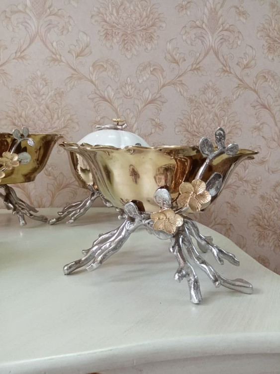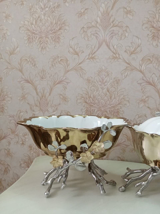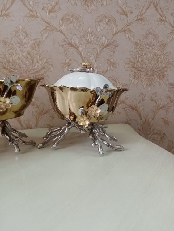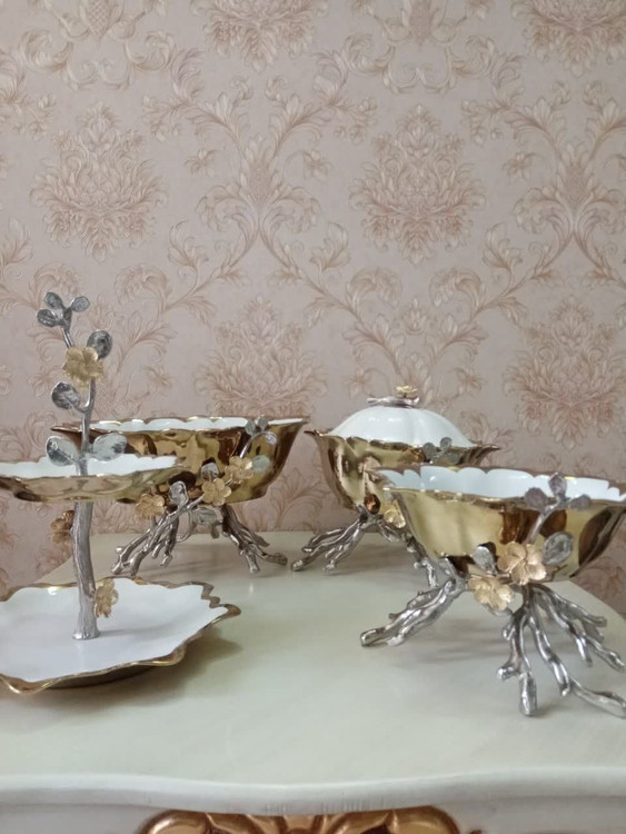 سرویس جدید ۴ تکه چینی طلایی با پایه نقره ای